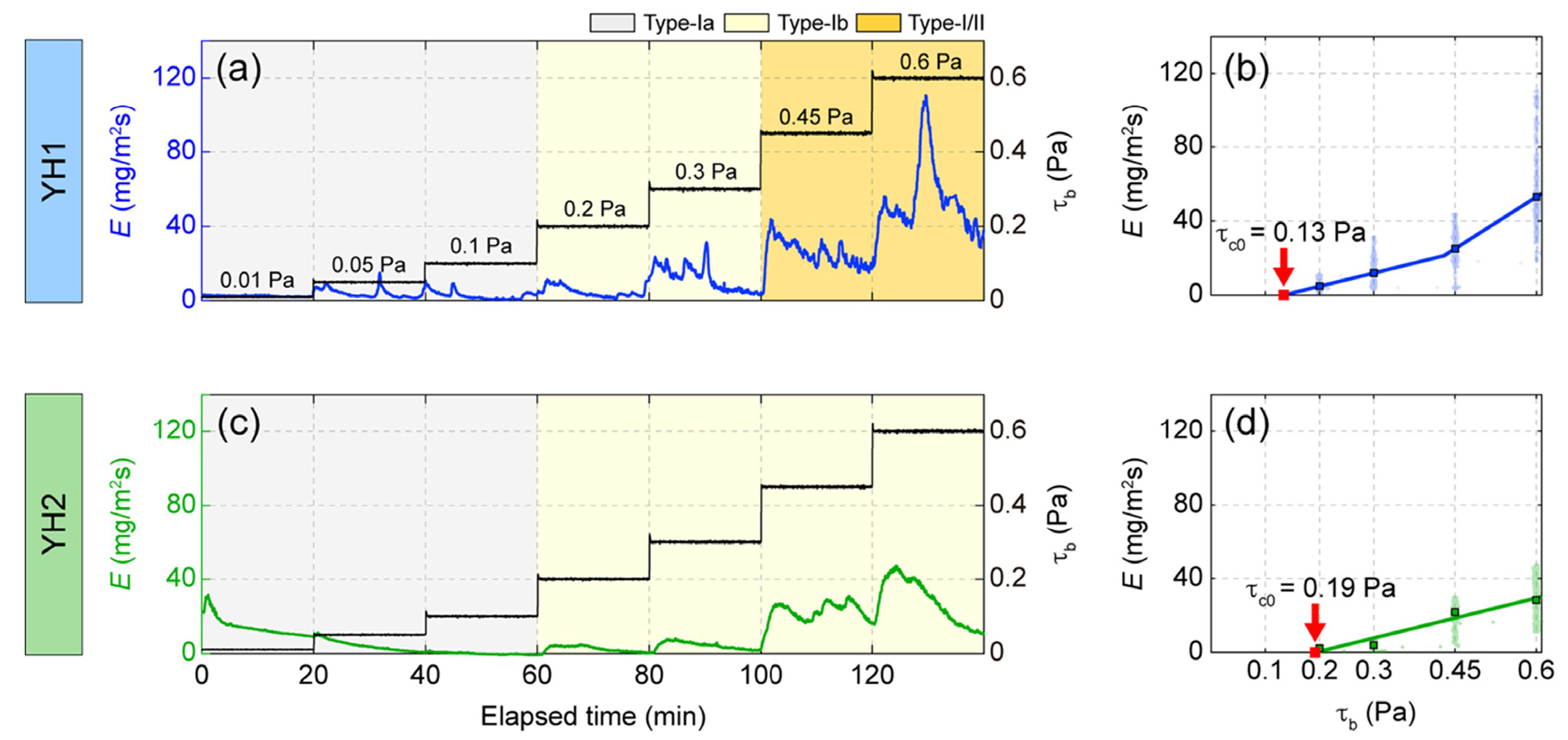 - Detention basins are environments where cohesive sediments readily absorb and settle together with contaminants originating from urban areas. Consequently, understanding sediment erodibility is essential to assess the behavior and dispersion of accumulated contaminated sediments. This study collected sediment samples at the inner (YH1) and outer (YH2) parts of Yonghyeon tidal creek (Hagik detention basin) located in Incheon to evaluate sediment stability, and to analyze physicochemical properties and heavy metal concentrations of sediments in order to identify spatial variations. YH1 had finer median particle size (YH1: 22.1 μm, YH2: 31.8 μm) and higher organic matter content (YH1: 10.1%, YH2: 5.1%) than YH2. The sediment erodibility experiment showed a lower initial critical shear stress for erosion (YH1: 0.13 Pa, YH2: 0.19 Pa) and a higher cumulative eroded mass (YH1: 121.3 g/m², YH2: 67.6 g/m²) at YH1 compared to YH2. At YH1, weakened current velocity caused by artificial island and continuous organic matter inputs from the sewage outfall reduced the consolidation of fine-grained sediments, resulting in lower sediment stability. At YH2, intermittent strengthened current velocity during the drainage gate opening led to the dominance of coarse sediments, resulting in higher sediment stability. Furthermore, heavy metal concentrations at YH1 were higher than YH2, with Cu, Ni, and Zn exceeding the NOAA Effect Range-Low thresholds by approximately 1.5, 1.1, and 2 times, respectively. Due to the more cohesive sediments at YH1 compared to YH2, contaminants were more readily absorbed from the sewage outfall and more easily released into the external environment through sediment erosion. Because inflows from the tidal creek can affect water circulation in the adjacent harbor, this study evaluated the erosion mechanisms of contaminated sediments and their potential dispersion by investigating sediment stability and contaminant characteristics within a contaminated urban detention basin.
