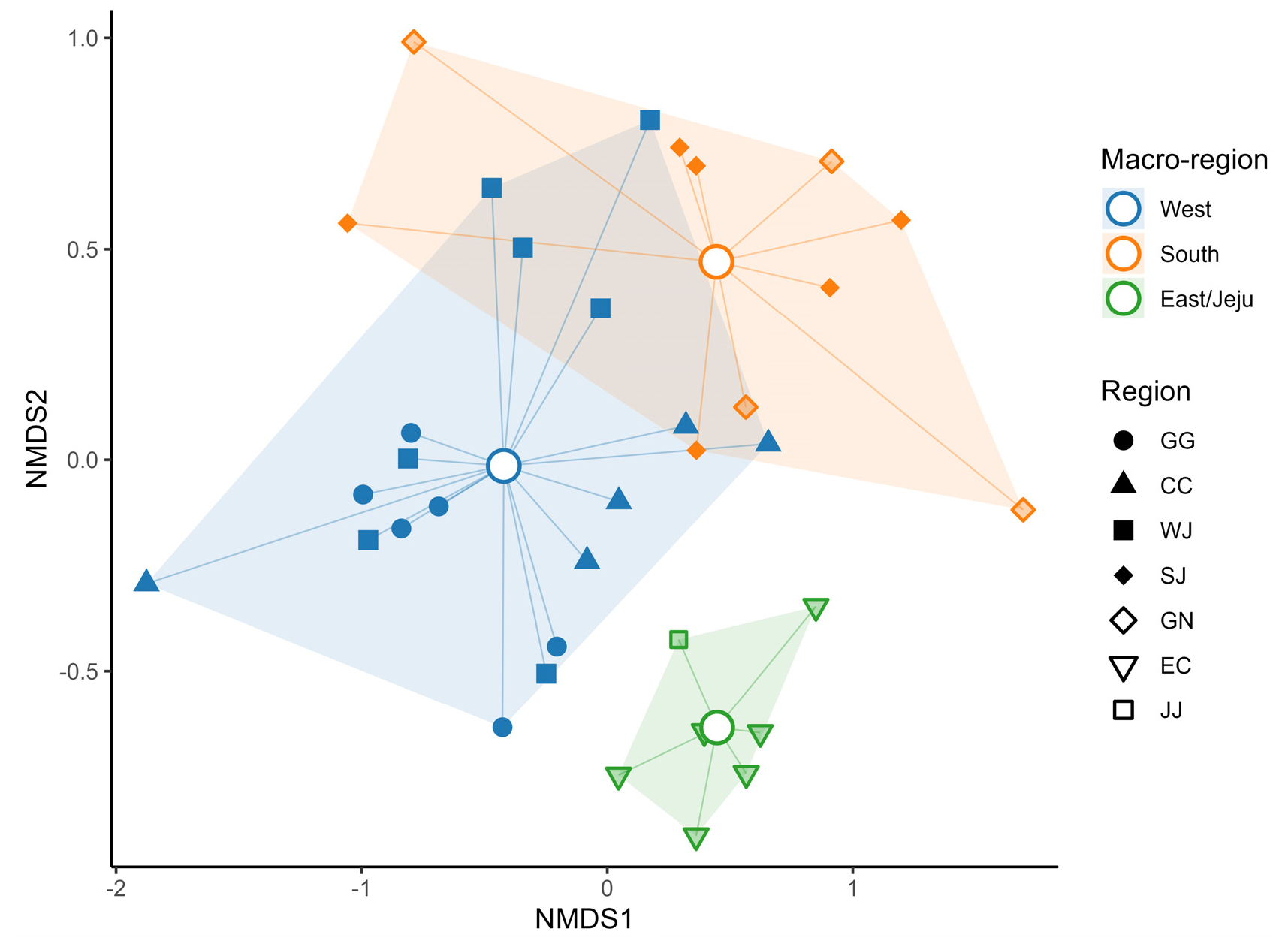 - Coastal wetlands serve as transitional zones linking terrestrial and marine ecosystems and provide critical habitats for diverse coastal bird species. However, rapid loss driven by reclamation, development, and climate change has raised global concerns about the decline of coastal bird populations. In this study, we analyzed the community structure and spatial distribution of coastal birds across 35 major coastal wetlands in Korea from 2016 to 2024. A total of 129 species and 579,635 individuals were recorded, with Dunlin Calidris alpina (20.60%) and Black-tailed Gull Larus crassirostris (15.43%) dominant at the species level, and shorebirds (54.30%) and gulls (21.49%) dominant at the taxonomic-group level. Community index patterns revealed strong regional contrasts: the Southern Jeolla region exhibited high species richness, diversity, and evenness with a ‘lognormal-type’ structure, whereas the Jeju region showed a ‘hollow-curve’ pattern driven by a few highly dominant species. NMDS (Non-metric Multidimensional Scaling) and PERMANOVA (Permutational Multivariate Analysis of Variance) analyses demonstrated clear separation of bird communities among the West, South, and East/Jeju coasts, indicating that habitat characteristics at the regional scale, rather than geographic distance alone, shape community structure. By taxonomic group, shorebirds were concentrated in western tidal flats, dabbling ducks dominated southern estuarine and brackish habitats, and gull assemblages were characteristic of the eastern coast. Additionally, 25 of the 35 survey sites (71.43%) met the Internationally Important Site (IIS) thresholds, with a total of 36 species (22 of which were shorebirds) identified as exceeding global population criteria. These findings highlight the high ecological significance of Korean coastal wetlands within the EAAF (East Asian–Australasian Flyway). The spatial patterns identified in this study underscore the need to incorporate both community- and habitat-level considerations when establishing region- and seascape-scale conservation strategies for coastal bird habitat networks.